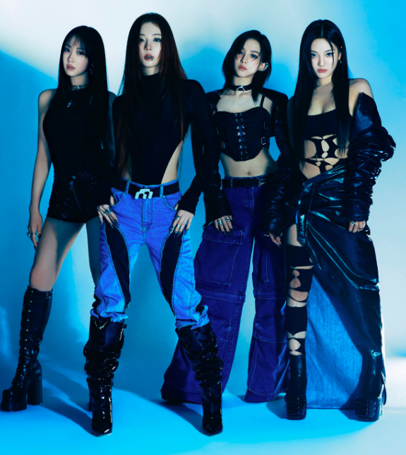 Dans ce visuel au ton glacial et futuriste, Aespa s’inscrit un look cyber-goth aux accents utilitaires et dominants. Le noir, les matières brillantes et les coupes structurées créent une unité visuelle forte, tout en laissant transparaître les singularités de chaque membre. Giselle affiche une silhouette minimaliste mais puissante avec une mini-short noire texturée, un débardeur asymétrique et des bottes plateformes à boucles, mêlant simplicité et agressivité. Winter se démarque par un body à découpes et des jeans bicolores oversize à empiècements contrastés. Son allure longiligne est renforcée par des bottes brillantes ultra montantes, dans un style presque post-apocalyptique. Karina joue la carte du corset militarisé et du pantalon cargo à poches en bleu jean, accentuant une esthétique plus utilitaire. Ses bagues massives et son col choké lui donnent une aura de dominatrice cyberpunk. NingNing est la plus dramatique : combinaison ajourée sous un manteau vinyle fendu, plateformes imposantes et pose assumée. Son look évoque une guerrière high fashion, entre séduction et pouvoir.