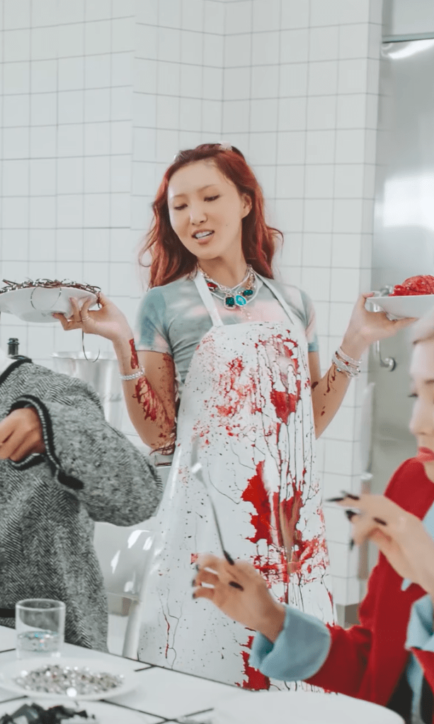Dans <Maria>, Hwasa mélange l’élégance et l’horreur avec une audace à glacer le sang. Dans la scène d’ouverture du clip devenue culte, elle apporte sur une table un cœur encore battant, le tablier éclaboussé de sang, comme une hôtesse d’un dîner aussi fashion que macabre. Derrière cette imagerie provocante se cache une métaphore puissante : celle d’une artiste qui offre son cœur au monde, quitte à se faire dévorer par le regard des autres.