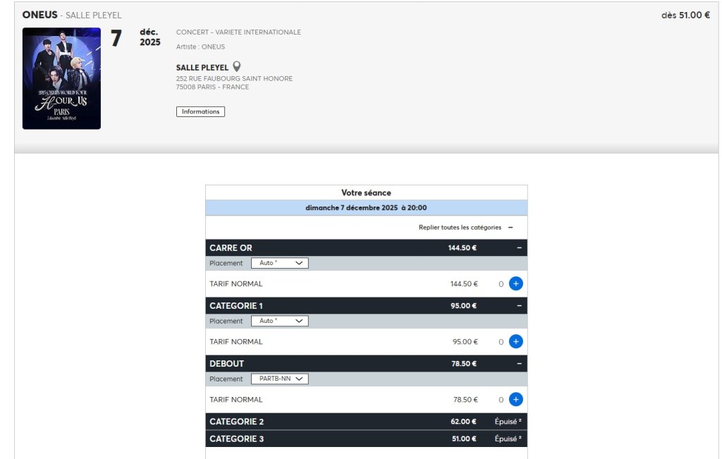 Côté billetterie, le dispositif est bien défini : la prévente a débuté le 30 septembre à 10h, suivie de la vente générale le 1er octobre à 10h (heures françaises). Les billets sont disponibles via AEG Presents France, Salle Pleyel et les plateformes associées. Vu la popularité de ONEUS et la rareté de la date en France, il est probable que les billets partent très rapidement